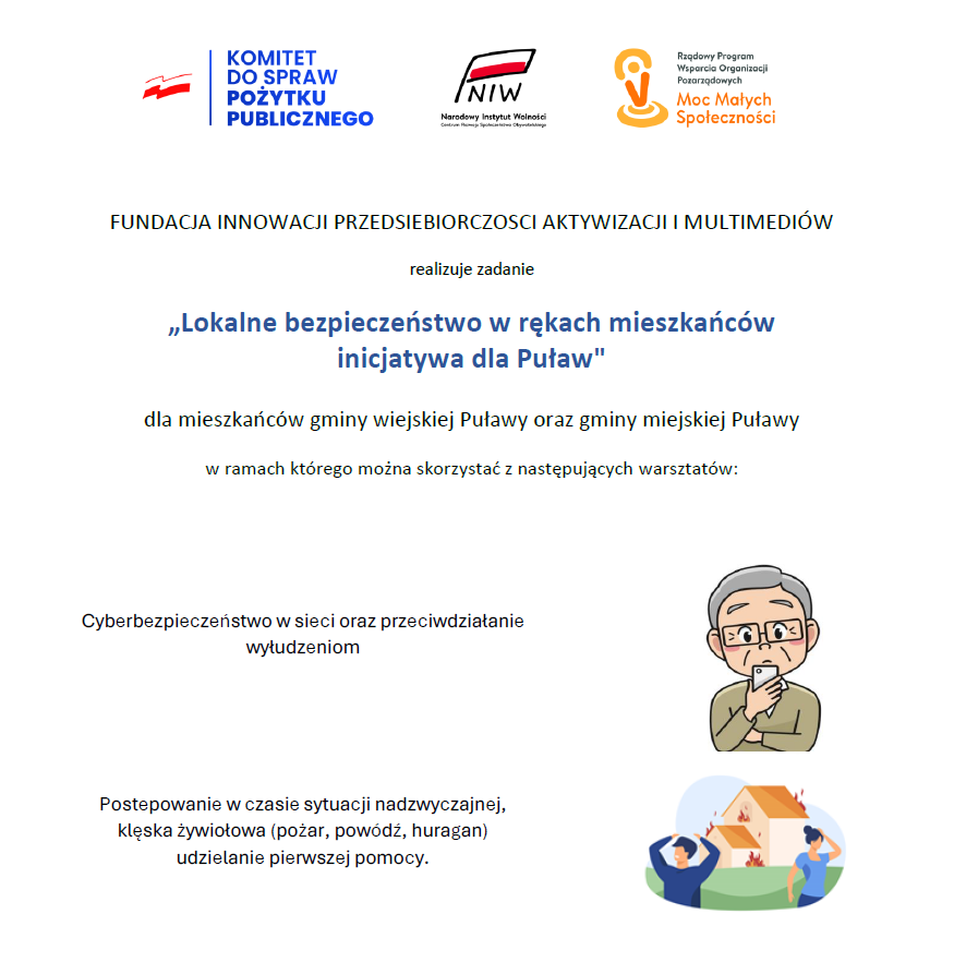 FUNDACJA INNOWACJI PRZEDSIEBIORCZOSCI AKTYWIZACJI I MULTIMEDIÓW w okresie od 01.09.2025 r. do 30.11.2025 r. realizuje zadanie „Lokalne bezpieczeństwo w rękach mieszkańców – inicjatywa dla Puław” dla mieszkańców gminy wiejskiej Puławy oraz gminy miejskiej Puławy.